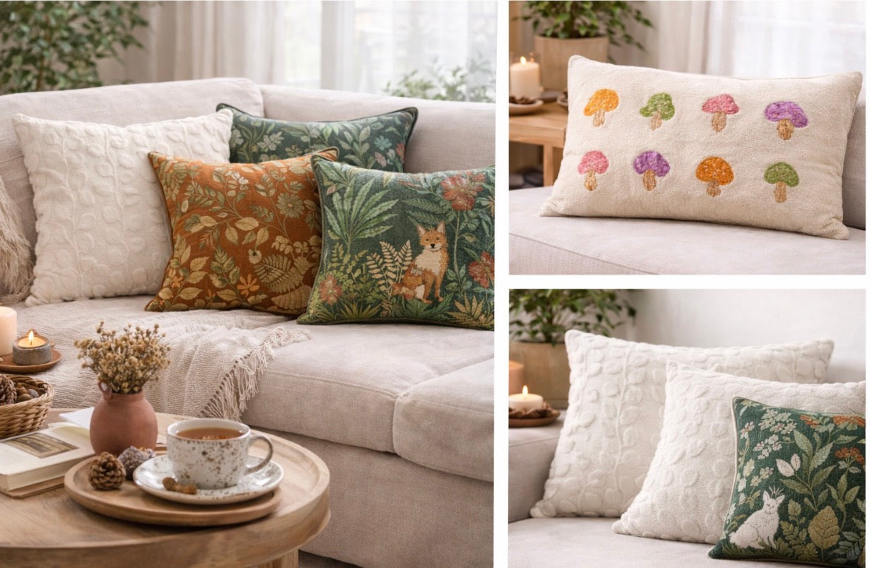 Explore our nature-inspired cushion covers featuring botanical, woodland, and floral designs, perfect for sofas, beds, and cosy interiors
